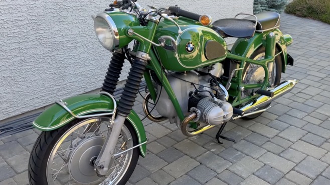In the video, a classic 1968 BMW R69 motorcycle is brought to life with a cold start, offering a glimpse into the engineering and elegance of a bygone era. The bike, painted in a striking green, stands proudly on a cobblestone driveway, reflecting the meticulous care it has received over the years.